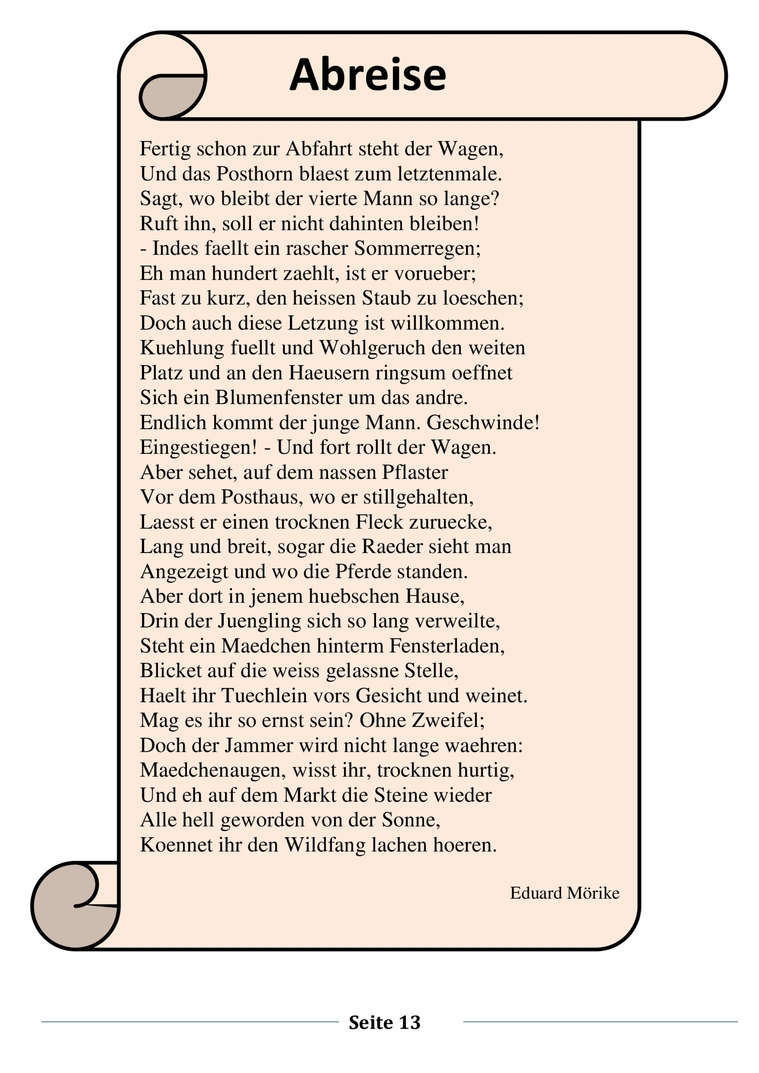 Seite 13 Fertig schon zur Abfahrt steht der Wagen, Und das Posthorn blaest zum letztenmale. Sagt, wo bleibt der vierte Mann so lange? Ruft ihn, soll er nicht dahinten bleiben! - Indes faellt ein rascher Sommerregen; Eh man hundert zaehlt, ist er vorueber; Fast zu kurz, den heissen Staub zu loeschen; Doch auch diese Letzung ist willkommen. Kuehlung fuellt und Wohlgeruch den weiten Platz und an den Haeusern ringsum oeffnet Sich ein Blumenfenster um das andre. Endlich kommt der junge Mann. Geschwinde! Eingestiegen! - Und fort rollt der Wagen. Aber sehet, auf dem nassen Pflaster Vor dem Posthaus, wo er stillgehalten, Laesst er einen trocknen Fleck zuruecke, Lang und breit, sogar die Raeder sieht man Angezeigt und wo die Pferde standen. Aber dort in jenem huebschen Hause, Drin der Juengling sich so lang verweilte, Steht ein Maedchen hinterm Fensterladen, Blicket auf die weiss gelassne Stelle, Haelt ihr Tuechlein vors Gesicht und weinet. Mag es ihr so ernst sein? Ohne Zweifel; Doch der Jammer wird nicht lange waehren: Maedchenaugen, wisst ihr, trocknen hurtig, Und eh auf dem Markt die Steine wieder Alle hell geworden von der Sonne, Koennet ihr den Wildfang lachen hoeren. Eduard Mörike Abreise