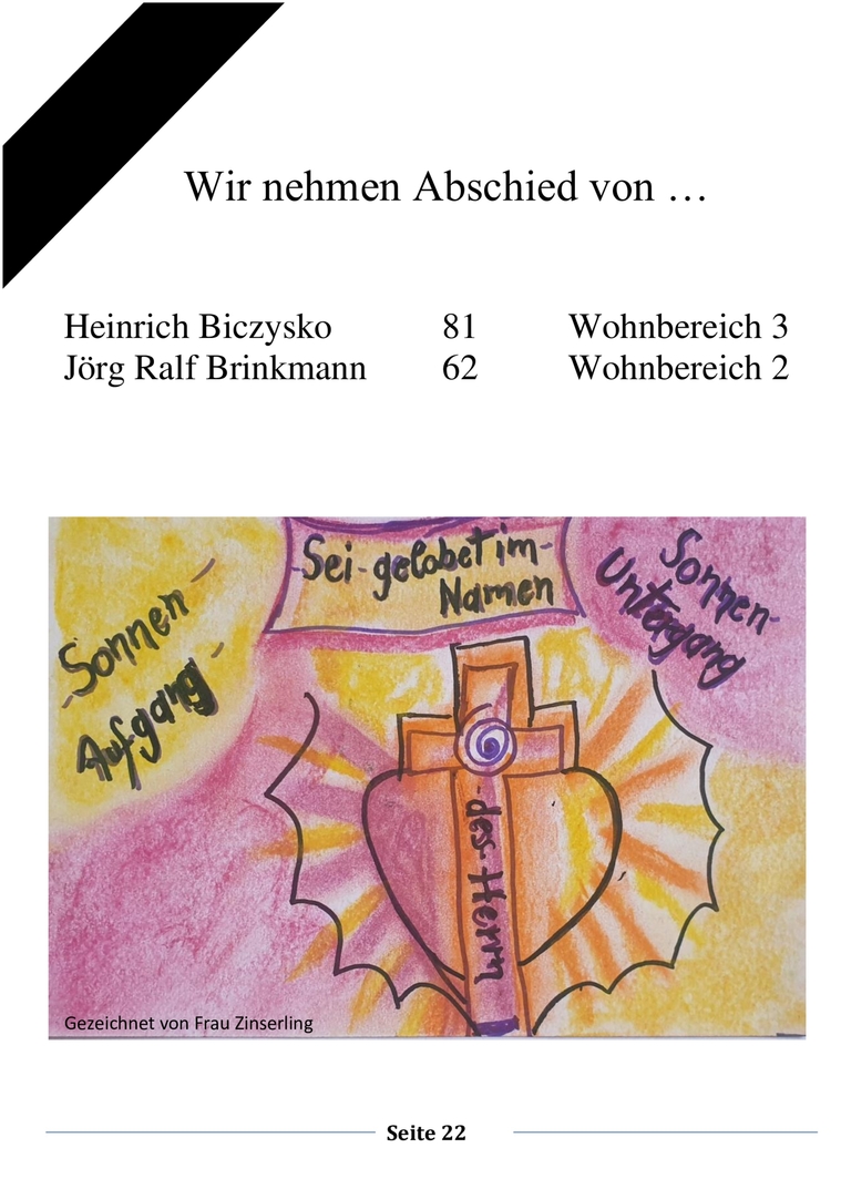 Seite 22 Wir nehmen Abschied von … Gezeichnet von Frau Zinserling Heinrich Biczysko 81 Wohnbereich 3 Jörg Ralf Brinkmann 62 Wohnbereich 2