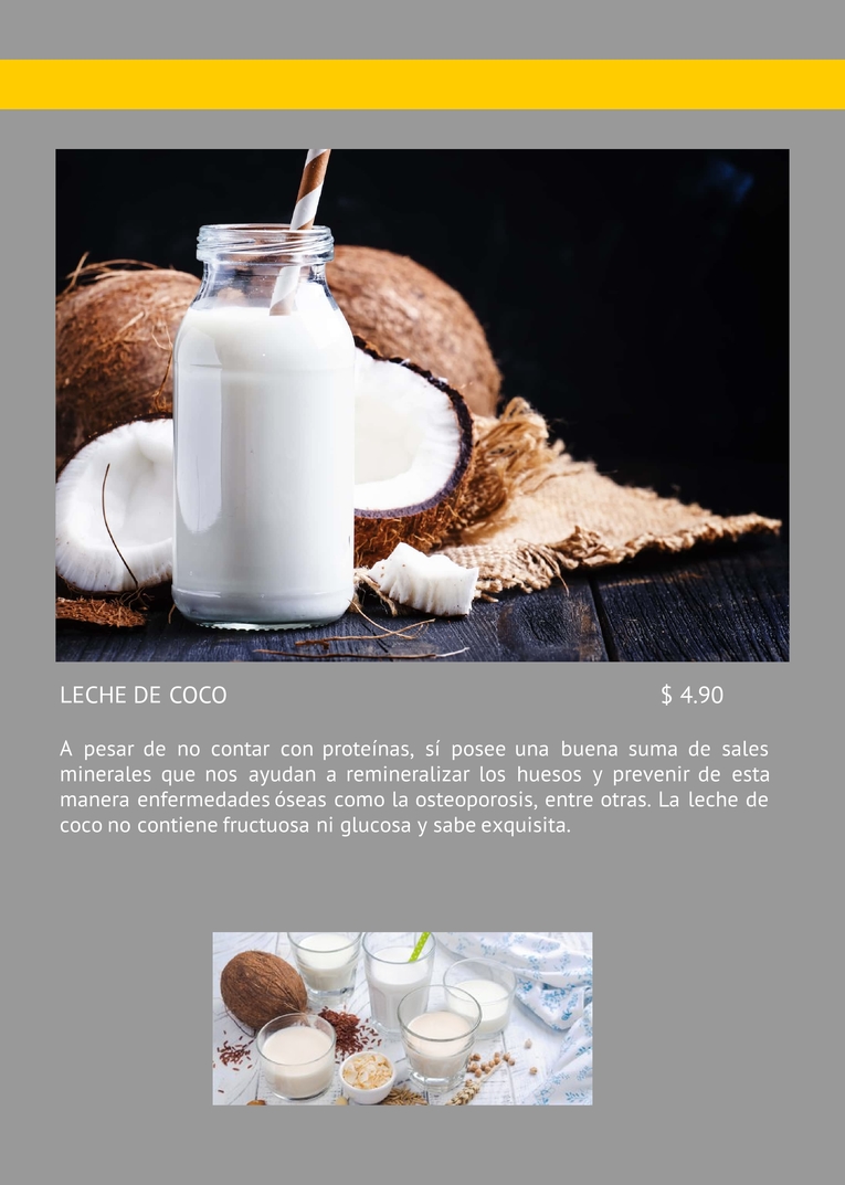 LECHE DE COCO $ 4.90A pesar de no contar con proteínas, sí posee una buena suma de sales minerales que nos ayudan a remineralizar los huesos y prevenir de esta manera enfermedades óseas como la osteoporosis, entre otras. La leche de coco no contiene fructuosa ni glucosa y sabe exquisita.