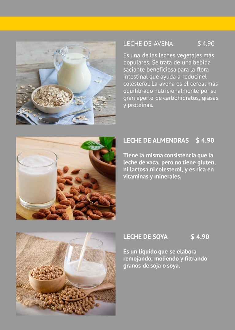 LECHE DE SOYA $ 4.90Es un líquido que se elabora remojando, moliendo y filtrando granos de soja o soya.