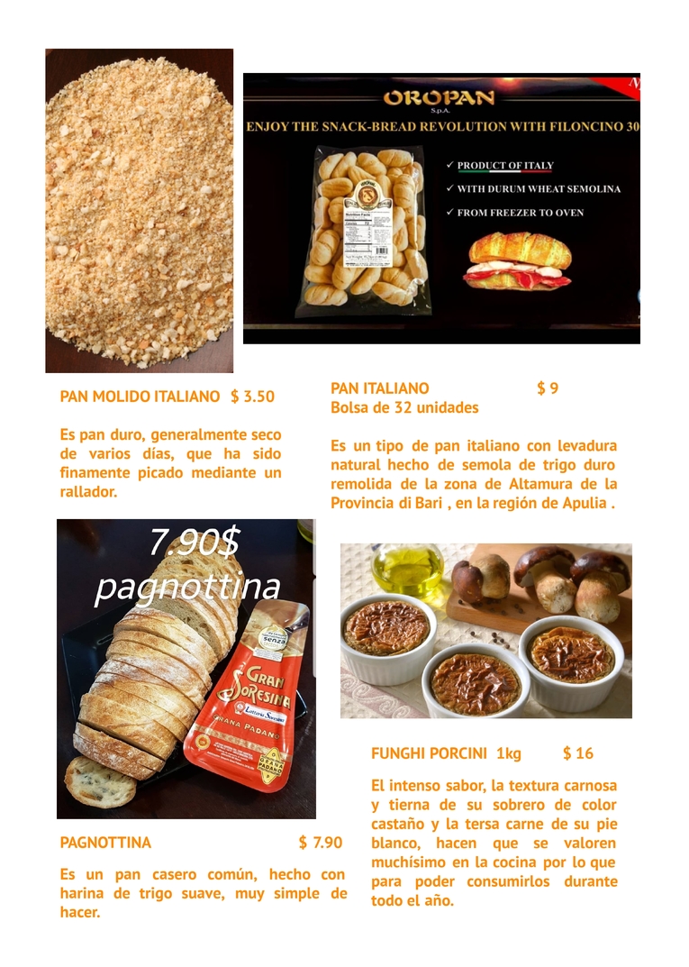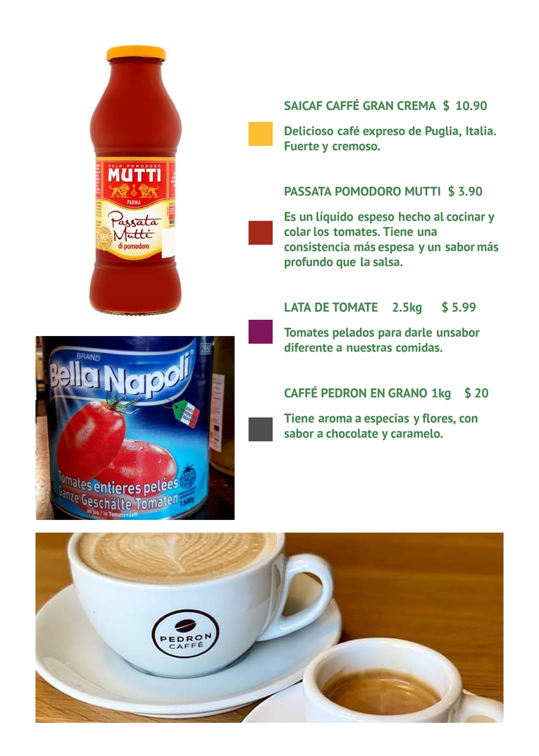 SAICAF CAFFÉ GRAN CREMA $ 10.90Delicioso café expreso de Puglia, Italia. Fuerte y cremoso.PASSATA POMODORO MUTTI $ 3.90Es un líquido espeso hecho al cocinar y colar los tomates. Tiene una consistencia más espesa y un sabor más profundo que la salsa. LATA DE TOMATE 2.5kg $ 5.99Tomates pelados para darle unsabor diferente a nuestras comidas.CAFFÉ PEDRON EN GRANO 1kg $ 20Tiene aroma a especias y flores, con sabor a chocolate y caramelo.